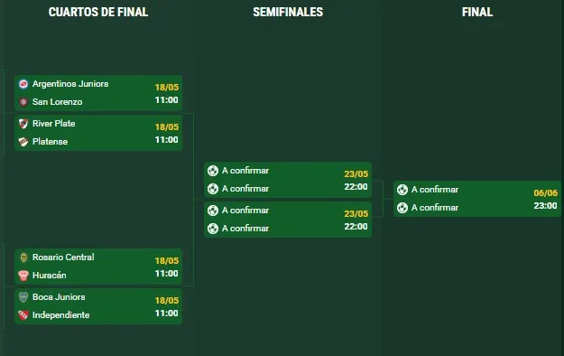 Los cuartos de final, que se desarrollarán el fin de semana del 18 de mayo, se jugarán en el estadio del mejor ubicado en la clasificación. Vale mencionar que por las elecciones en CABA, la gran mayoría de los partidos se disputarán viernes o lunes, con la excepción de Central que será local en Rosario.