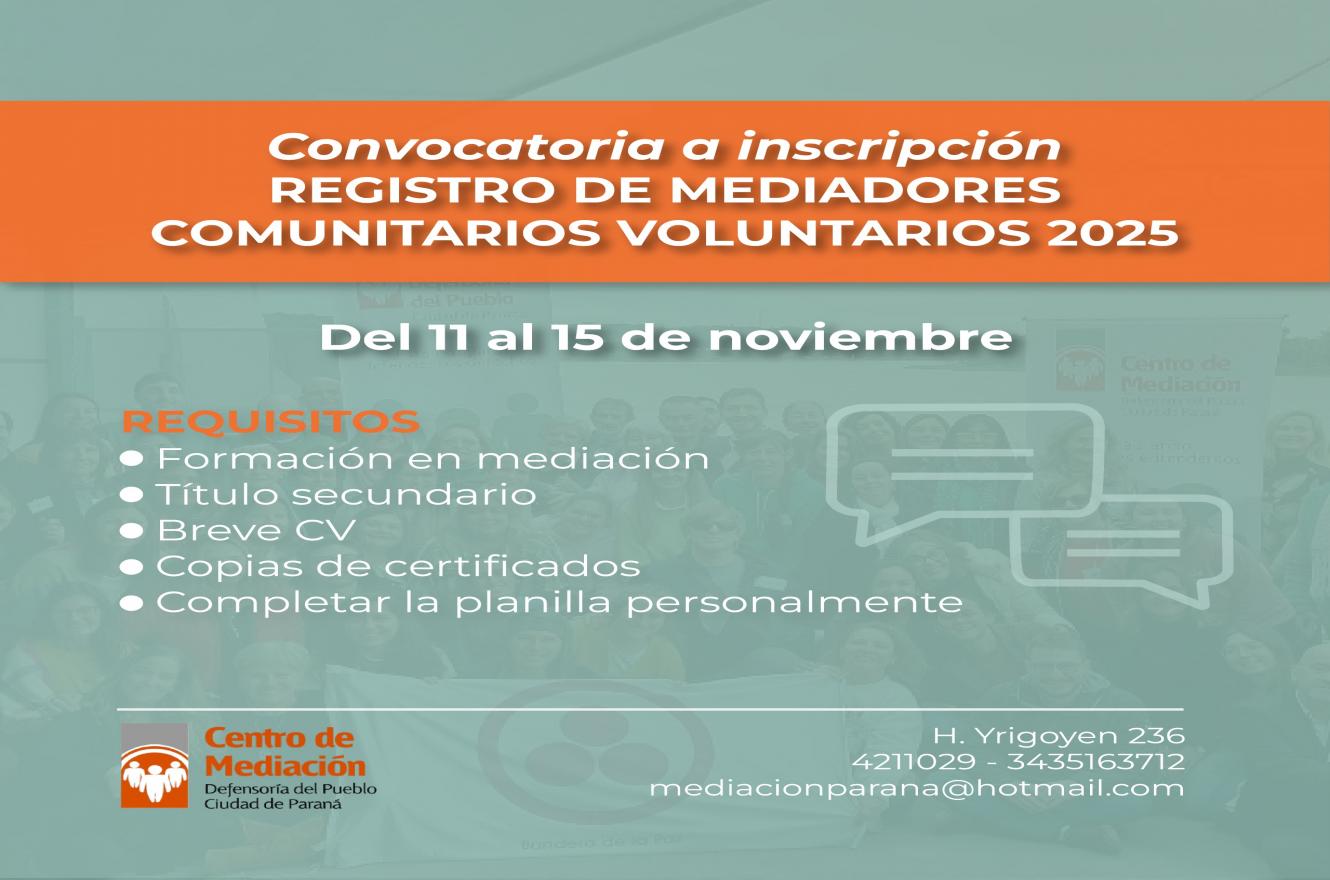 El Registro de Mediadores Comunitarios voluntarios y ad honorem que funciona en el ámbito del Centro de Mediación de la Defensoría del Pueblo de Paraná se renueva cada año, a través de una convocatoria pública que se realiza en noviembre.