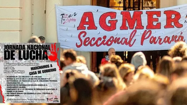 Este miércoles 11 de septiembre, en el Día del Maestro, los docentes de la Asociación Gremial del Magisterio (Agmer) Paraná, nucleada en la Multisectorial de Entre Ríos, convocó a una marcha desde la plaza 1° de Mayo hacia Casa de Gobierno con distintos reclamos. La concentración será a partir de las 9.30.