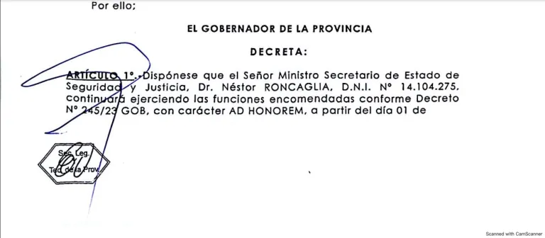 El decreto dispone que, a partir del 1 de septiembre del corriente, el titular de la cartera de Seguridad y Justicia continuará ejerciendo sus funciones, conforme decreto N°245/23 con carácter Ad Honorem.