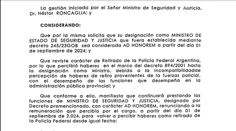 De acuerdo a lo que indica la normativa, Roncaglia volverá a cobrar la jubilación que percibía como retirado de la Policía Federal Argentina (PFA). Ese haber había quedado en suspenso por incompatible cuando asumió el Ministerio de Seguridad, convocado por el mandatario electo en 2023.