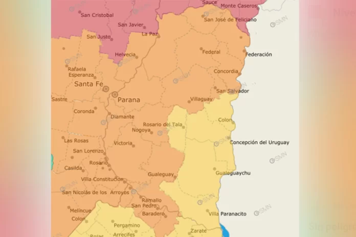 El Servicio Meteorológico Nacional emitió una alerta naranja por temperaturas extremas para los departamentos Paraná, Diamante, Nogoyá, Victoria, Gualeguay, Federal, Federación, Feliciano, Villaguay, Concordia, La Paz y San Salvador.