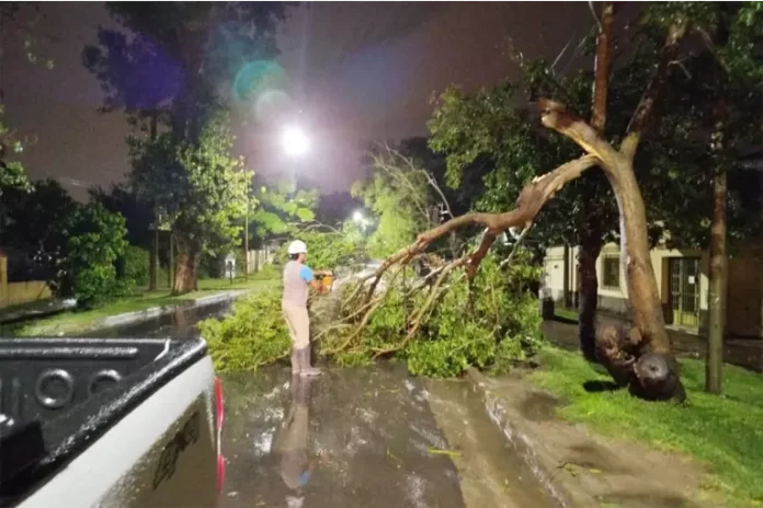 Durante la tormenta, se reportaron caídas de árboles en varios puntos de la ciudad. En calle Illia, cerca de Gualeguaychú, una rama de gran tamaño cayó sobre un vehículo, mientras que en la calle 1613, frente a la Base Aérea, un poste de electricidad y telefonía se desplomó sobre la puerta y ventana de una vivienda. Además, en la calle Larramendi, un árbol de gran puerta interrumpió la circulación, y se registraron postes caídos y voladura de techos en las zonas sur y este de la ciudad”.