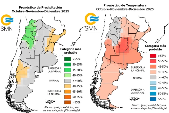 El Servicio Meteorológico Nacional (SMN) difundió su pronóstico climático trimestral para octubre, noviembre y diciembre de 2025, con tendencias que marcan una primavera más cálida de lo habitual en amplias zonas del país, acompañada por precipitaciones que se ubicarán en valores normales en el centro y el Litoral, pero con excesos y déficits según la región.