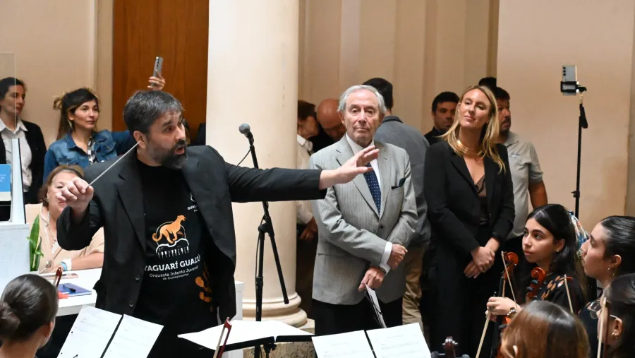 Luego, en el hall del Palacio Municipal, la escena se volvió más íntima y celebratoria. La Orquesta Infanto Juvenil Yaguarí Guazú, dirigida por Santiago Veronesi, junto a alumnos de la Escuela Gervasio Méndez, interpretaron canciones del reconocido artista. A ese momento se sumaron el profesor de música Maxi Benetti y los raperos Kevin Arnold “Key” y Rodrigo Bordoli “Triko”, en un cruce generacional que amplió el homenaje hacia nuevas formas de expresión musical.