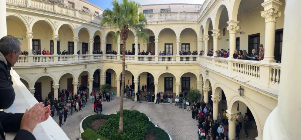 A las 10 los trabajadores comenzaron a salir de sus respectivas oficinas y los balcones que dan al patio central de la Casa de Gobierno se empezaron a colmar.