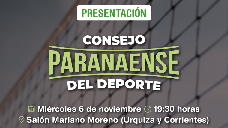 Este miércoles se presentará el Consejo Paranaense del Deporte. Será desde las 19.30 en el Salón “Mariano Moreno” del Concejo Deliberante. Se trata de un órgano de articulación y coordinación entre el Municipio, las instituciones deportivas y otros actores clave del deporte en la ciudad de Paraná.
