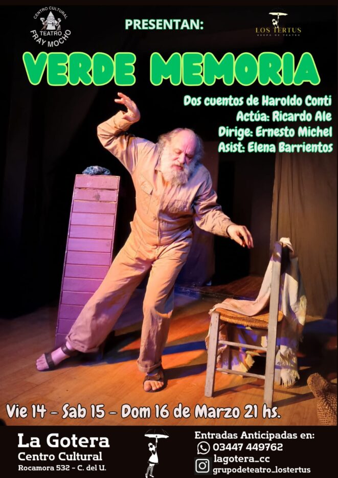 «La vida de un hombre es un miserable borrador, un puñadito de tristezas que cabe en unas cuantas líneas. Pero a veces, así como hay años enteros de una larga y espesa oscuridad, un minuto de la vida de un hombre es una luz deslumbrante”. Haroldo Conti – Espectáculo unipersonal en base a los cuentos «Balada del álamo carolina» y «El último».